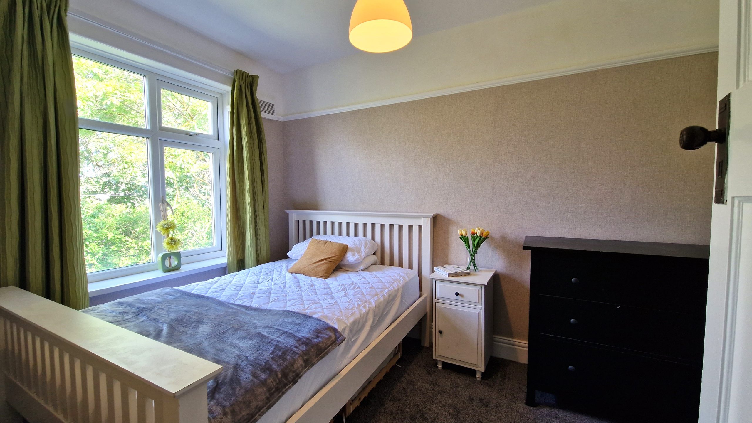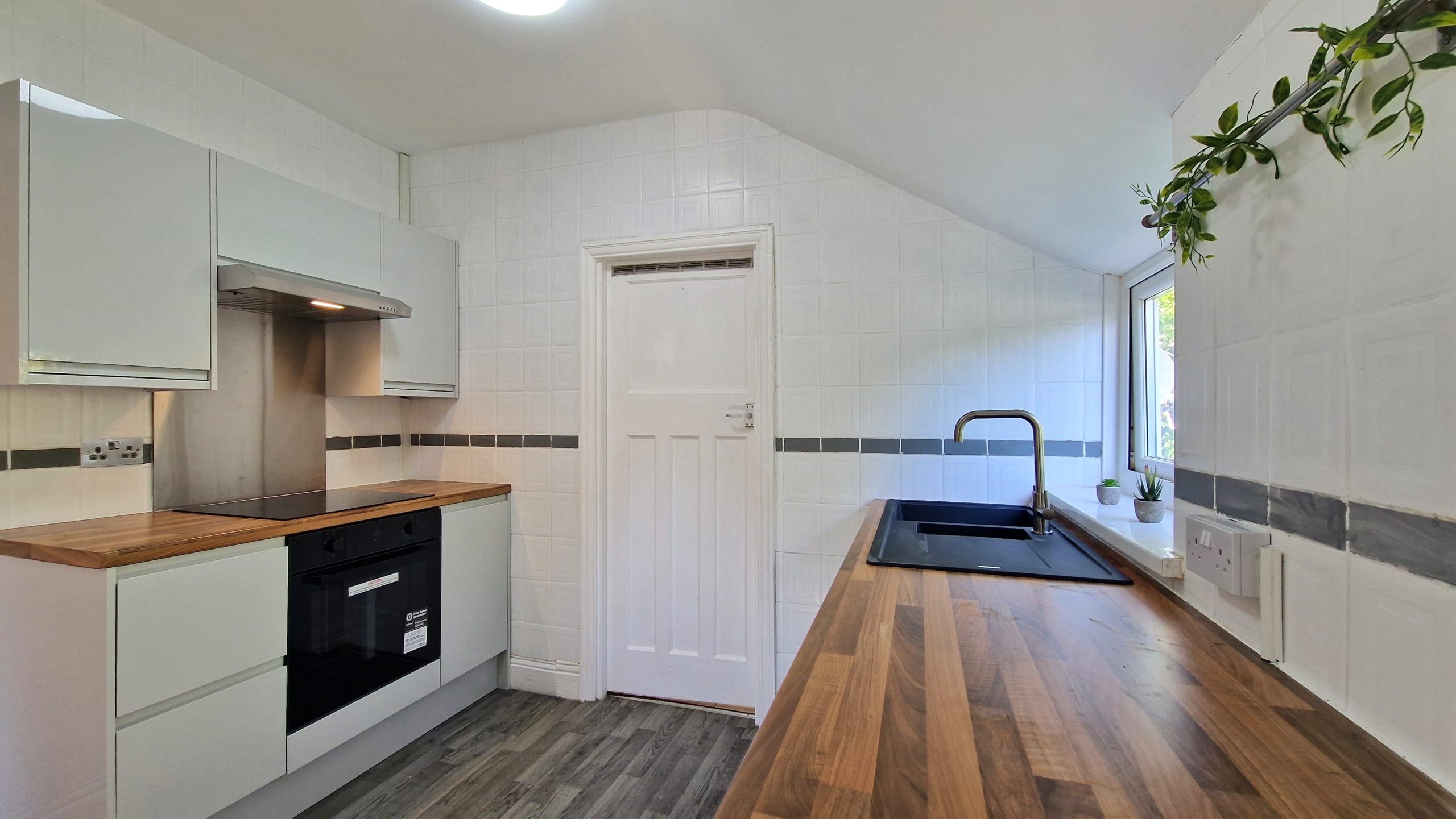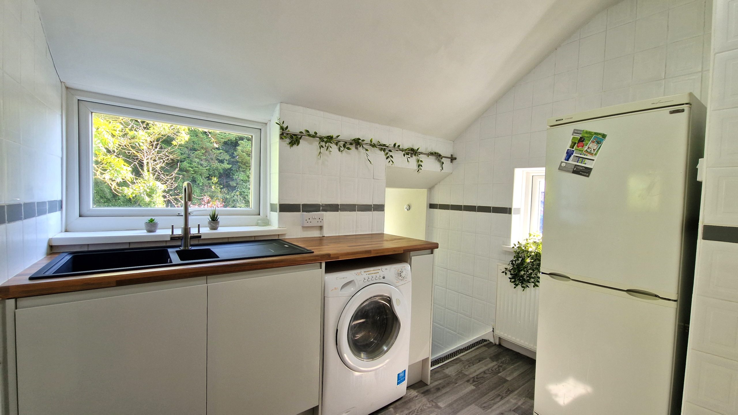 The kitchen is fresh from a full upgrade, and comes with stylish work-tops and cupboard units, with built-in oven, electric hob, fridge freezer and washing machine all provided.